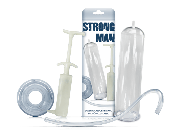 Tenha relações mais intensas bebê com o Strong Man!!! Uma bomba peniana manual com tecnologia de pressão a vácuo, composta por um tubo transparente, um (Anel) em silicone que se adapta perfeitamente ao pênis, uma mangueira para a passagem do ar e uma seringa de bombeamento manual. Você sabia que as bombas penianas são ótimas para o tratamento da ejaculação precoce, impotência masculina, auxiliar no desenvolvimento momentâneo do órgão masculino, além de melhorar a circulação sanguínea do pênis, o que proporcionar orgasmos melhores!