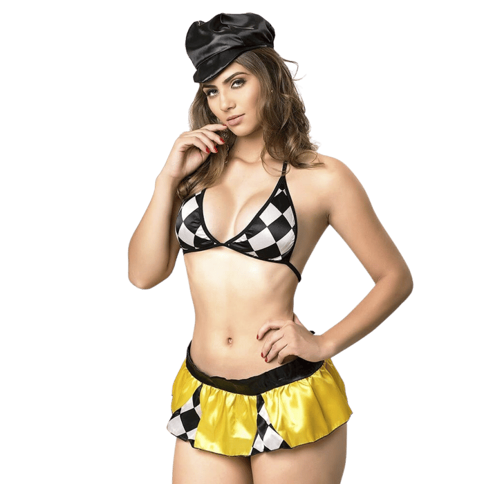 A Fantasia "Táxista" da Pimenta Kente, toda confeccionada em cetim te deixa pronta para ousar para seu parceiro naquele momento especial.