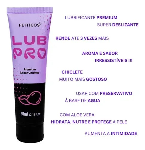O LubPro com Sabor é um lubrificante beijábel da marca Feitiços Aromáticos, uma das mais tradicionais fábricas de cosméticos sensuais do Brasil, a Feitiços é uma empresa que preza pela qualidade de seus produtos e satisfação de seus clientes.
