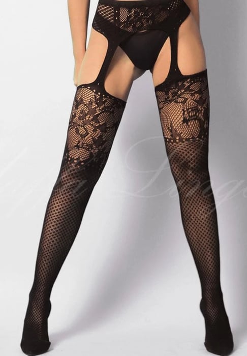 Meia Cinta Liga com Detalhes 2003. Meia com cinta liga arrastão, detalhes vazados e ramos de flores. Provocante e irresistível para aquelas noites em que você desejar seduzir.